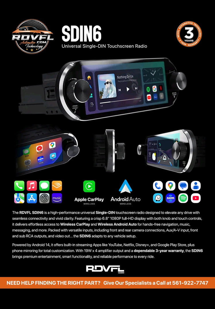 RDVFL - SDIN6 Radio is a high quality, Universal Touchscreen Single DIN Radio with Wireless CarPlay and Wireless Android Auto, full 1080P HD resolution screen, and includes a 3 year warranty.